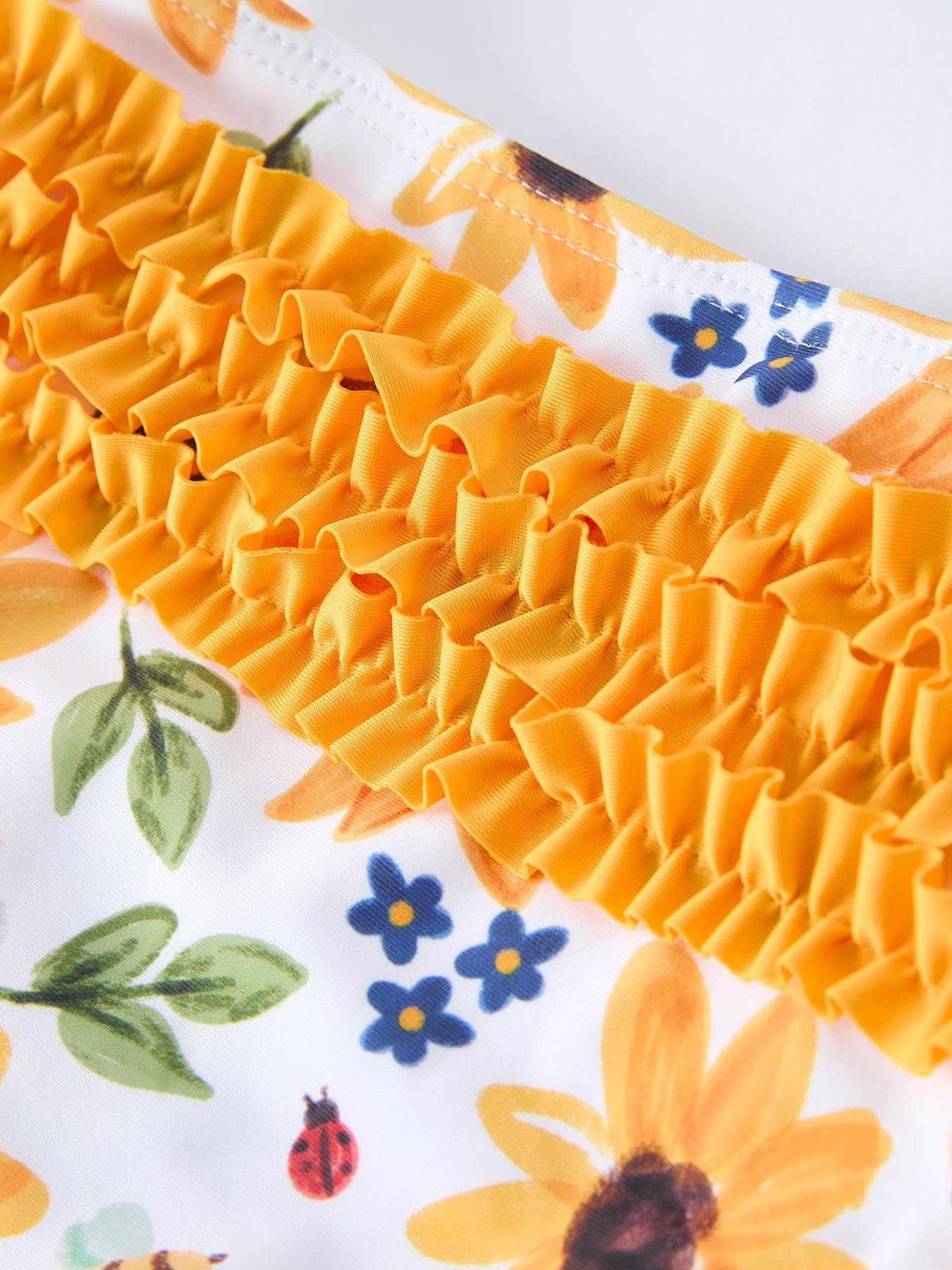 Let your little one make a splash in this charming two-piece swimsuit featuring a vibrant sunflower print. The delicate ruffle straps add a playful touch while providing secure, comfortable coverage for active water play. Crafted with durability in mind, this swimsuit is perfect for pool days, beach outings, and summer adventures. The cheerful design keeps her feeling confident and stylish, while quality construction ensures it holds up to repeated wear and washing. An essential piece for any toddler's warm-weather wardrobe.